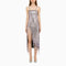 Lavender rhinestone asymmetric midi dress from The Attic with side slit, decorative fringes and thin straps. Size and Fit - Model wears size 38 F R Model measurements: Height: 178 cm Chest: 80 cm Waist: 60 cm Hips: 87 cm