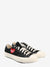Black cotton low top sneaker from Comme des Garçons Play featuring a round toe, a white lace up front, a contrasting white toe cap, a red heart printed logo to the side and a thick white rubber sole. bassa Chuck...
