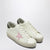 Sneakers by Golden Goose Deluxe Brand in white leather, characterized by a rubber platform sole, round toe, lace-up closure, pink star patch on the side, dark green leather heel tab with logo and vintage effect finish.