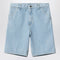 Short Carhartt WIP in light blue heavy cotton denim with a worn effect, characterized by a comfortable leg, regular waist, triple stitching, tool pockets, hammer loop, square fabric logo label on the back pocket, front closure with zip and button, and belt loops. Size and Fit - Model wears size 33 Model measurements: Height: 187 cm Chest: 102 cm Waist: 76 cm Hips: 92 cm