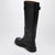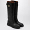 Black calf leather boot from Valentino Garavani featuring a high bootleg, a strap with Signature VLogo detail and buckle fastening, a round toe, light gold hardware and a rubber sole.