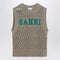 Ganni round-neck gilet in grey recycled cotton blend, featuring contrasting logo lettering inlay on the front, perforated design, and ribbed edges. Size and Fit - Model wears size S Model measurements: Height: 178 cm Chest: 89 cm Waist: 62 cm...