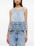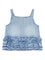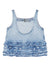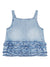 Denim top with ruffles, thin shoulder straps, crew neck with backless. s/m, frill Organic cotton denim top