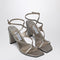 Platinum-coloured metallic leather Jimmy Choo sandal, featuring a square open toe, strappy upper, block heel, adjustable ankle strap with buckles, and leather sole. Size and Fit - Heel 8,5 cm
