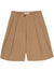 camel brown cotton poplin texture tailored design tonal stitching belt loops two side inset pockets pleat detailing to the front knee-length rear patch pocket concealed fly and button fastening doppia piega Double pleated cotton shorts Size and Fit - This piece fits true to size. We recommend you get your regular size. Model is 1,75m / 5ft 8in wearing size 1 (NUM).